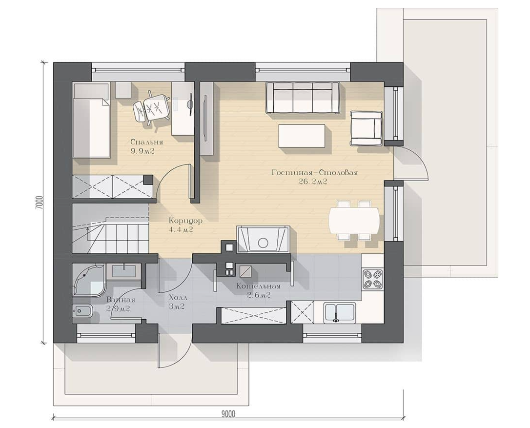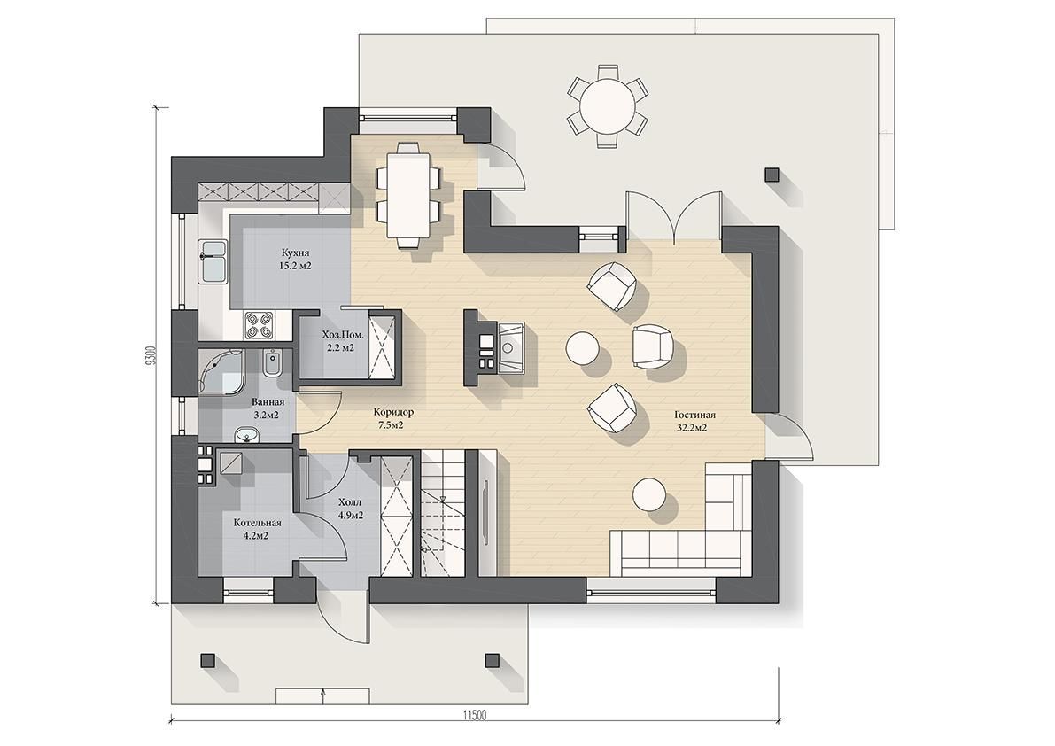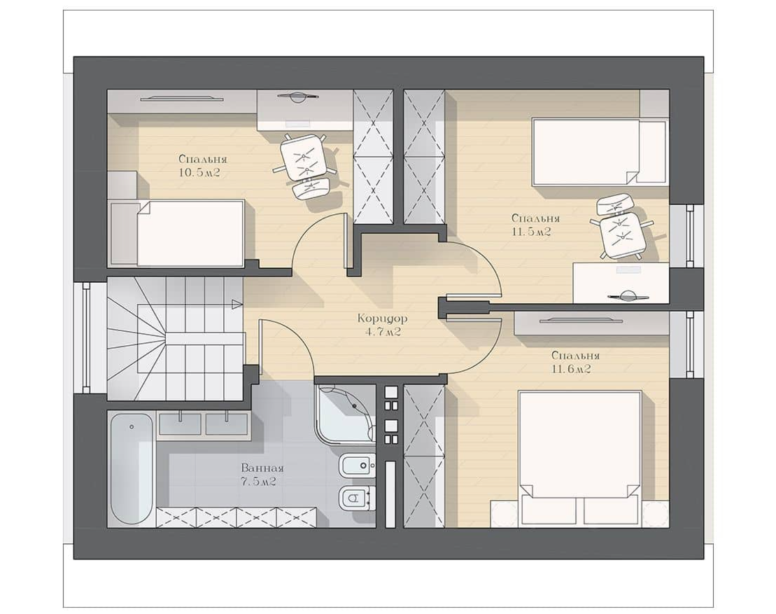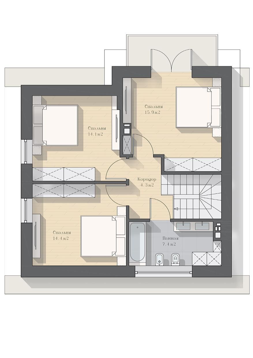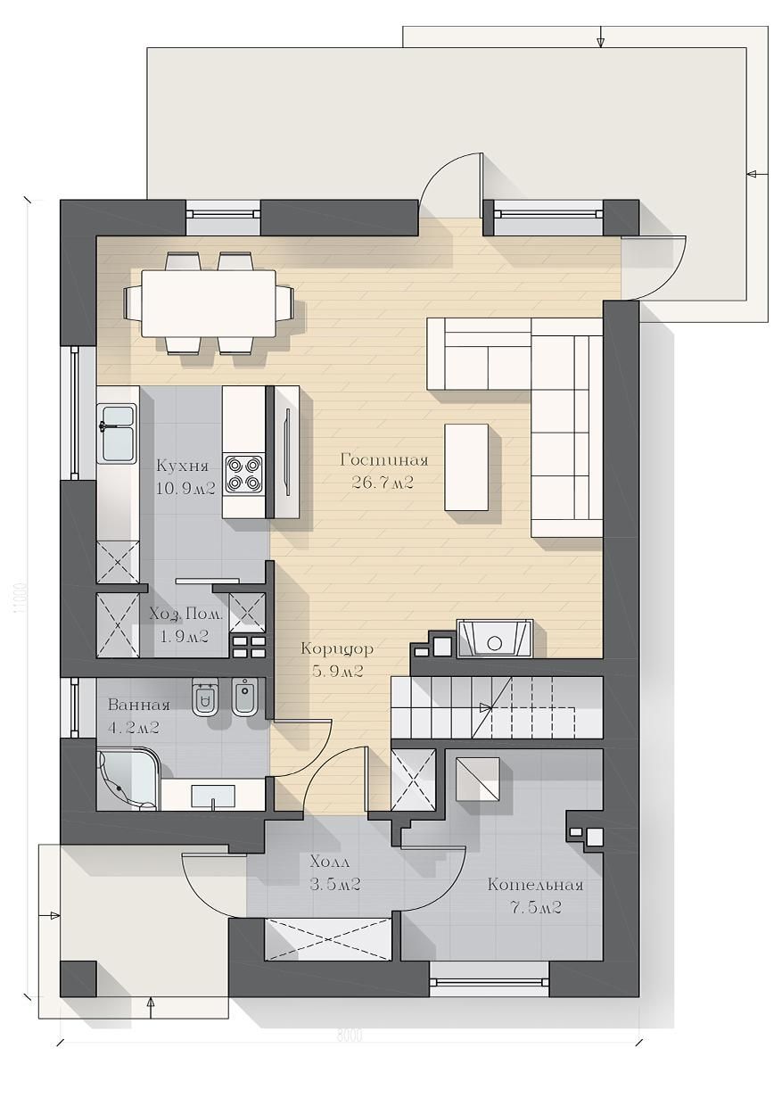 | Габариты | 7,2 м 8,9 м | Площадь дома, м² | 112 |