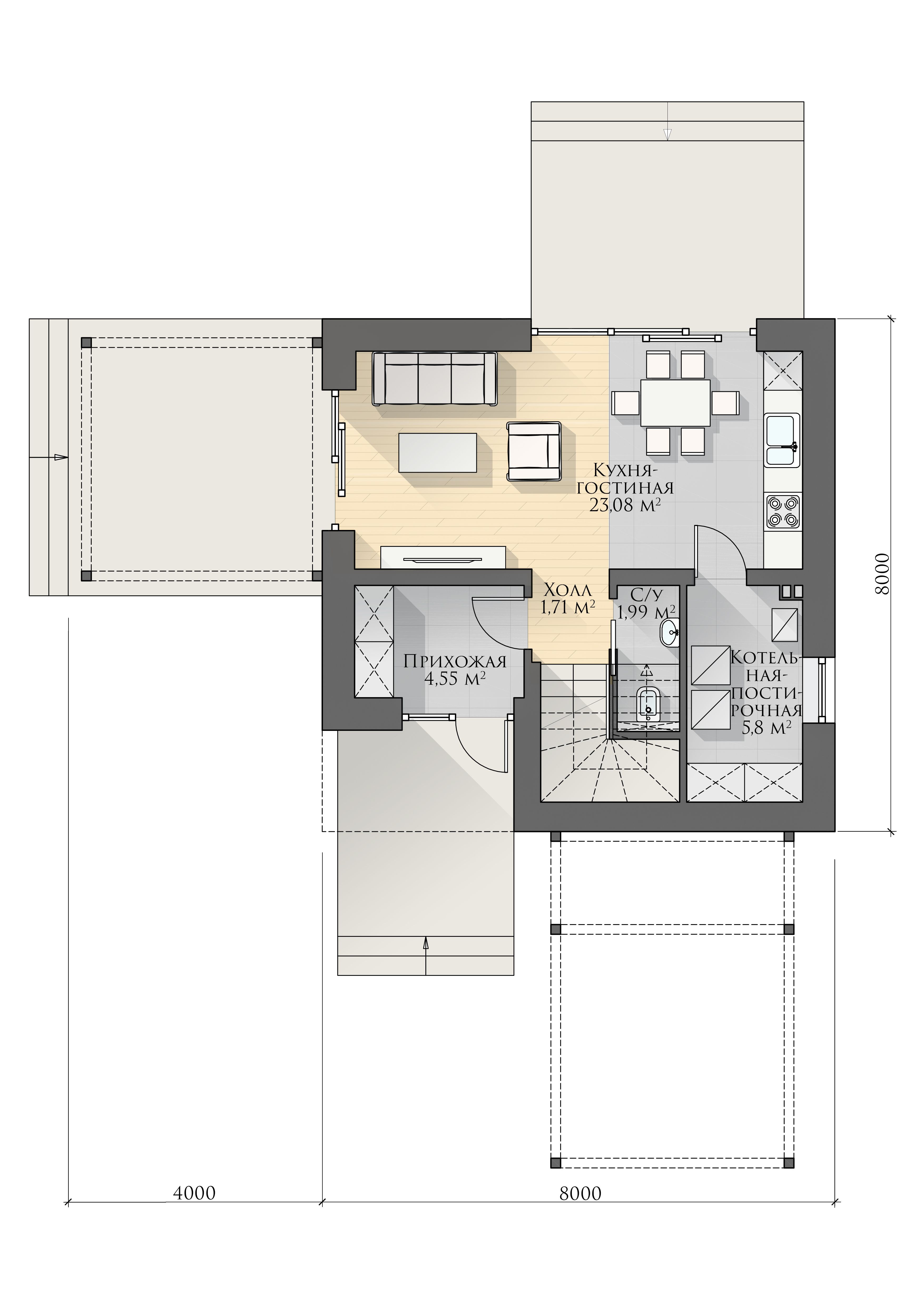 | Габариты | 8 м 8 м | Площадь дома, м² | 105 |