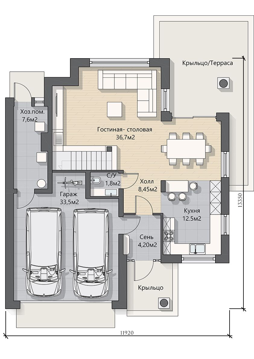 | Габариты | 12 м 13,4 м | Площадь дома, м² | 216 |